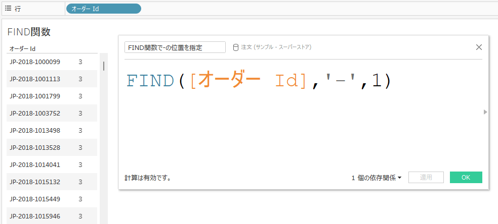オーダーIdの各データ「JP-2018-~」の内、最初の-(ハイフン)の位置を取得出来ているのがお分かりいただけると思う。
